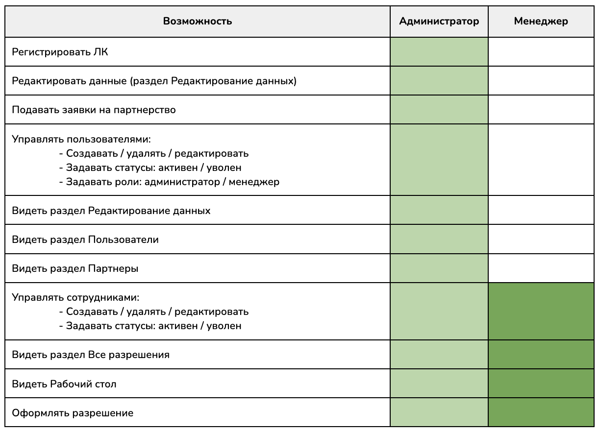 В разделе есть 2 роли пользователей: администратор и менеджер. Роль администратора имеет доступ ко всем возможностям системы. Роль менеджера ограничена: