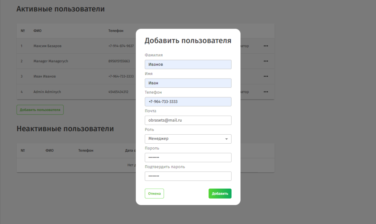 - Заполните форму и нажмите Добавить. Теперь новый пользователь отображается в блоке Активные пользователи.