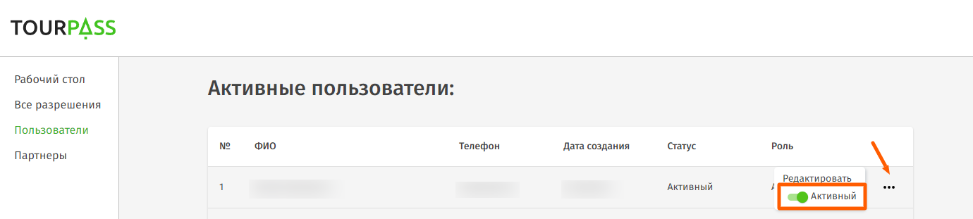 - Чтобы закрыть пользователю доступ в личный кабинет, переведите переключатель в статус Неактивный в меню “…” напротив нужного пользователя.