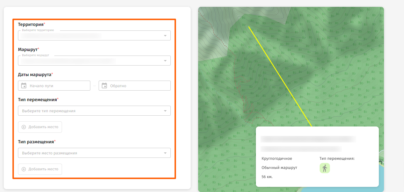 - Выберите маршрут(-ы), укажите даты маршрута(-ов), а также тип перемещения и тип размещения.