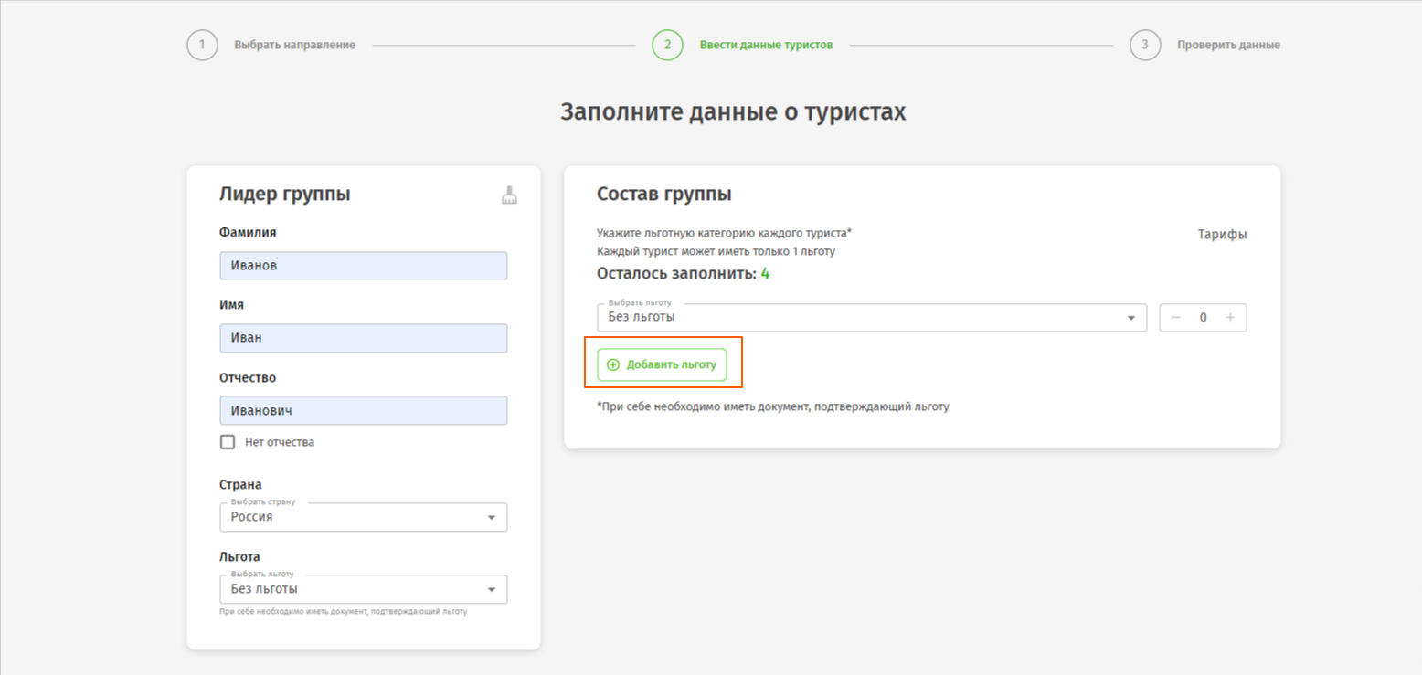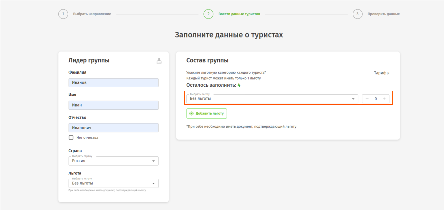 5b. Укажите льготы остальных туристов в группе. Для этого выберите льготу из списка и укажите кол-во туристов с этой льготой.