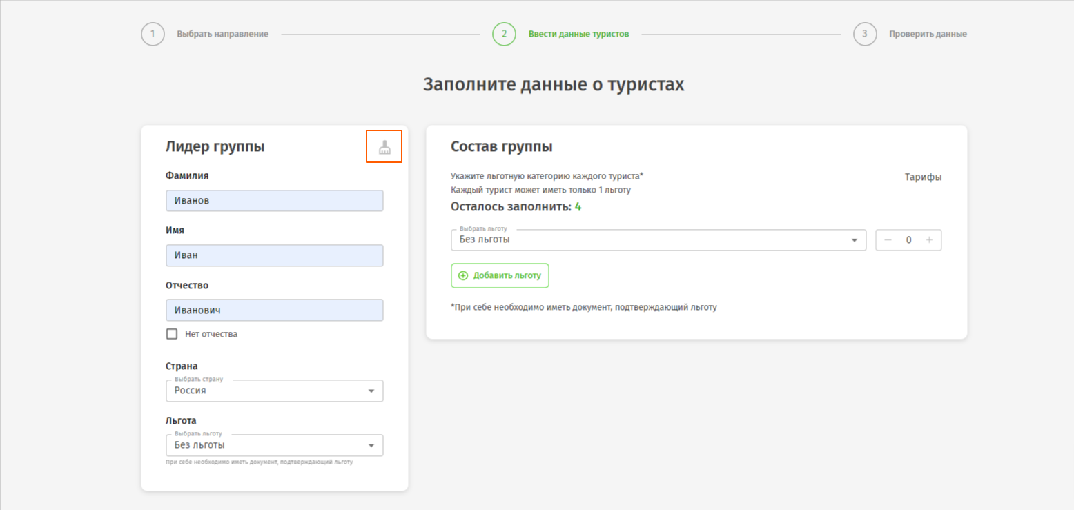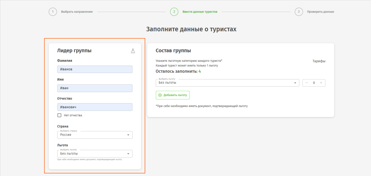 5a. Введите информацию о главном туристе (лидере группы) в форму слева: