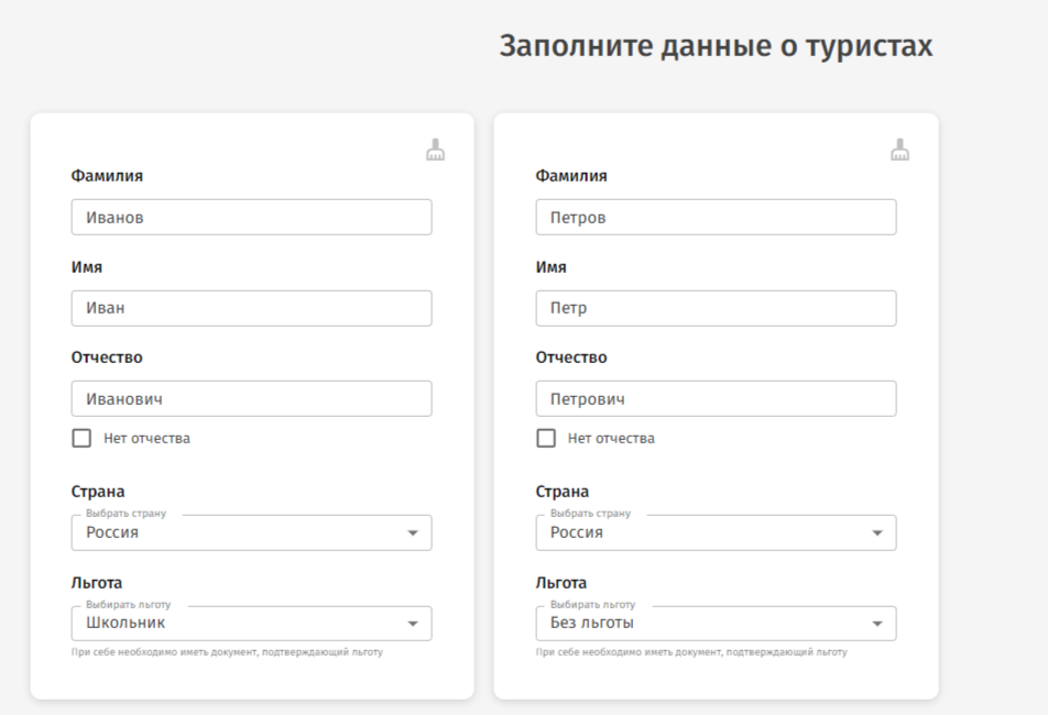 На данном шаге необходимо внести информацию о туристах в группе. Количество карточек соответствует количеству туристов, которое вы указали на предыдущем шаге